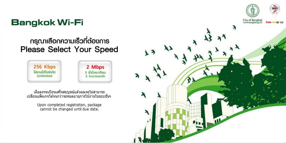 สดๆร้อนๆ หลังจากกทม และทรู ให้บริการ Wi-Fi ฟรี ผ่าน @TRUEWIFI คราวนี้เป็นเฟสใหม่ ปรับความเร็วเพิ่มเติมจากบริการ Green Bangkok Wi-Fi เดิม โดยให้บริการ 2 รูปแบบคือ ความเร็วสูงสุด 256Kbps / 128Kbps ใช้งานได้ไม่จำกัดชั่วโมง (แต่ระบบจะตัดการเชื่อมต่อทุก 90 นาที สามารถเชื่อมต่อใหม่ได้) และความเร็วสูงสุด 2Mbps / 512Kbps ใช้งานได้ 5 ชั่วโมงต่อเดือน ผู้สนใจสามารถลงทะเบียนด้วยเลขบัตรประจำตัวประชาชน ลงทะเบียนผ่านเว็บไซต์ เพื่อการใช้งานที่ต่อเนื่อง ซึ่งผู้ใช้สามารถเลือกใช้บริการ Wi-Fi ฟรี ได้ตามสถานที่ที่มีบริการเครือข่าย Wi-Fi (สังเกตสัญลักษณ์ True Wi-Fi แบบในภาพมุมขวาบน) โดยเชื่อมต่อสัญญาณ Wi-Fi ผ่าน SSID @TRUEWIFI (ตัวใหญ่ทั้งหมด) ส่วนความเร็วสูงสุด จะใช้งานได้ตามข้อกำหนดของแพ็คเกจที่เราสมัครไว้ และมีข้อกำหนดคือ จะต้องเลือกแพ็คเกจให้ดี เพราะเฟสใหม่ต่ออายุทุก 6 เดือน นั่นหมายถึงว่า หากเลือกแพ็คเกจใด ก็จะเปลี่ยนแปลงแพ็คเกจไม่ได้จนกว่าจะครบ 6 เดือน ซึ่งบัญชีที่ล็อกอิน Bangkok Wi-Fi จะขึ้นต้นด้วย BK และมีนามสกุลต่อท้ายคือ @truewifi (จะมีให้เลือกในหน้าล็อกอิน) และสำหรับการใช้งาน ในการล็อกอินครั้งหนึ่ง 1 user สามารถออนไลน์ได้ 1 เครื่องเท่านั้น หากจะใช้ออนไลน์เครื่องอื่นจะต้อง Log out ออกก่อน