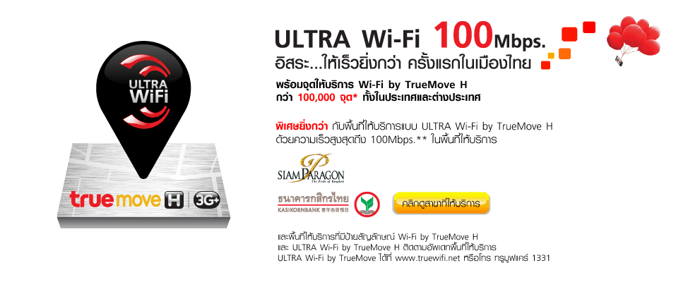 ใครที่เป็นลูกค้าธนาคารกสิกรไทย แล้วใช้ TruemoveH ก็จะได้สิทธิ์ในการใช้ Wi-Fi ฟรีของ TruemoveH โดยจะมีบริการ 2 แบบ คือความเร็วสูง Ultra Wi-Fi by TruemoveH ความเร็ว 100Mbps. และ 8Mbps. สาขาที่ร่วมรายการ